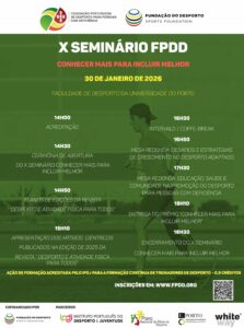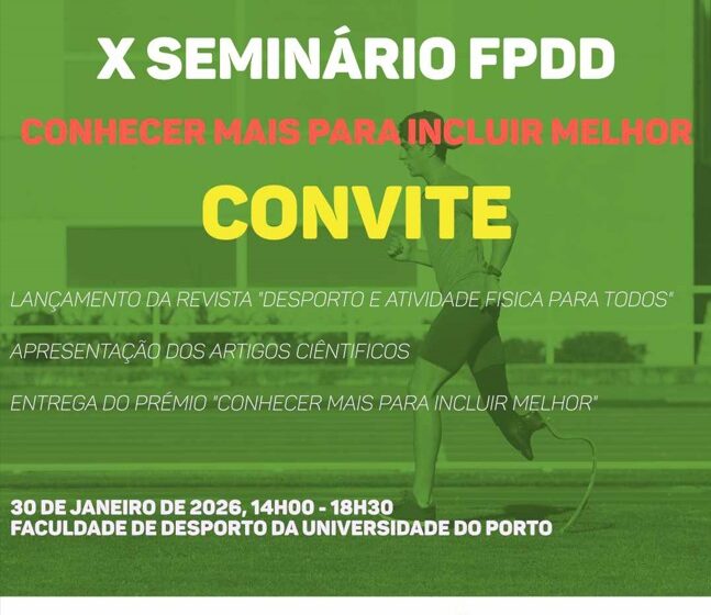 O X Seminário da FPDD – “Conhecer Mais para Incluir Melhor”, organizados pela Fundação do Desporto e pela Federação Portuguesa de Desporto para Pessoas com Deficiência (FPDD), terá lugar no próximo dia 30 de janeiro de 2026, na Faculdade de Desporto da Universidade do Porto (FADEUP), assinalando os 10 anos de publicação da Revista da FPDD, “Desporto e Atividade Física para Todos”.